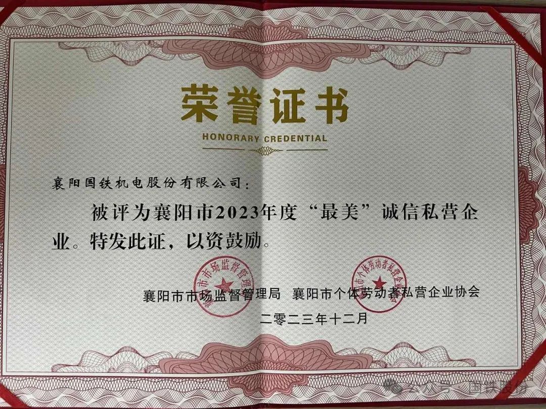 【喜報】國鐵機電獲“襄陽市2023年度‘最美’誠信私營企業”榮譽
